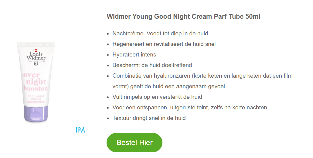 2. Widmer Young Good Night Cream: Na een lange dag verdient onze huid wat verwennerij. De ‘Good Night Cream – overnight booster’ is daar perfect voor. Gebruik na de reiniging, eventueel na het ‘Extrait Liposomal’ serum voor diepere hydratatie. Deze nachtcrème biedt: