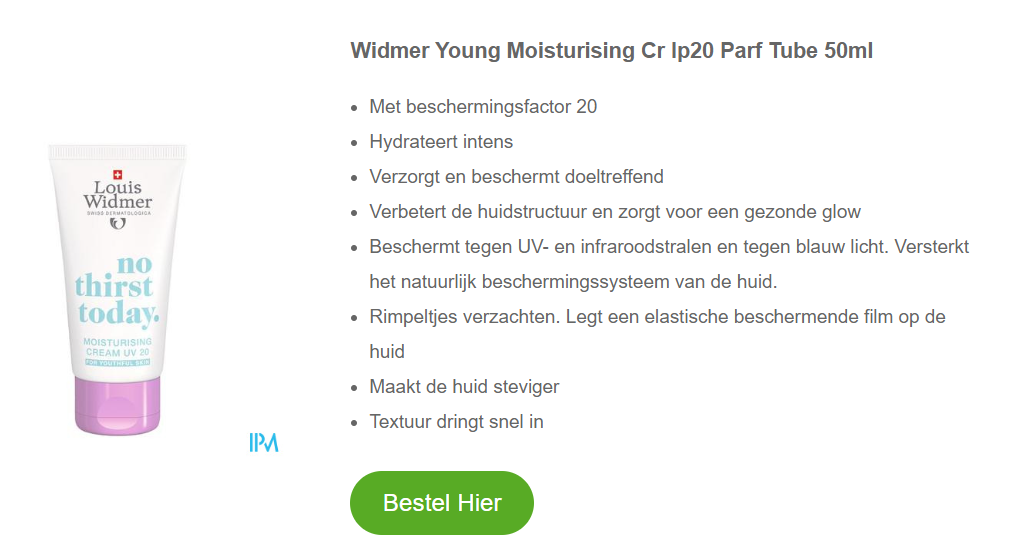 3. Widmer Young Moisturising Cream: De ‘Moisturising Cream UV 20 – no thirst today’ is essentieel voor bescherming overdag. Breng aan na de reiniging, maar vermijd de ogen. De crème: